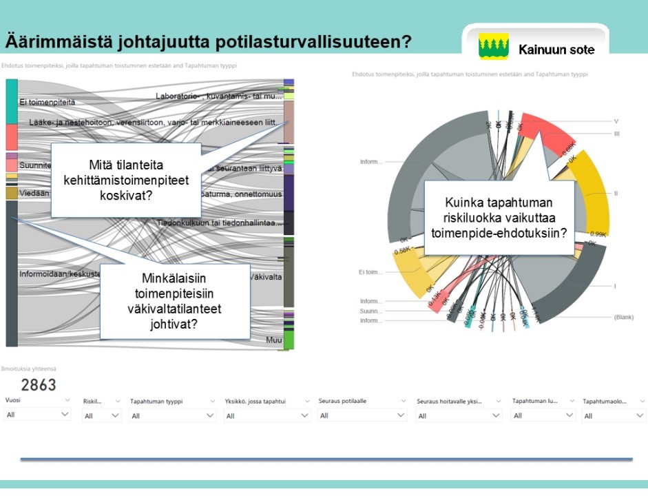 Sain syksyllä taannoin tiedon, että vaaratapahtumailmoituksista on mahdollista luoda ladattavia raportteja HaiPro-ohjelmistosta ja ilmoitusten tietoa on helppo jatkojalostaa. Tämä mahdollisti haittatapahtumien tarkastelun esimerkiksi Power BI -sovelluksella. Tämä mahdollisti esimerkiksi perhepalveluiden tulosalueella tehtyjen ilmoitusten vertaamisen helpommin kansallisiin tutkimuksiin (ks. Ruuhilehto ym. 2011) sekä olemassa olevan aineiston hyödyntämisen monipuolisesti. Tein perhepalveluiden sosiaali- ja terveyspalveluiden haittatapahtumailmoituksista (n = 2112) visualisoinnin, joka mahdollistaa haittatapahtumien tarkastelun eri näkökulmista ja osin näkökulmista, joita HaiPro-sovelluksen raportointitoiminto ei sellaisenaan mahdollista (mm. ilmoitukset suhteessa aikaan, monen vuoden tarkastelu kokonaisuutena, vuosittainen kehitys/muutos, haittatapahtumien tarkastelu ilmiöittäin ym.). Visualisointi on laadittu koko tulosalueen näkökulmasta, mutta sovelluksella on helppo muokata ja suodattaa näkymää esimerkiksi yksittäisen työyhteisön näkökulmaan. Vastaavasti koko kuntayhtymän haittatapahtumailmoituksista olisi mahdollista muodostaa samankaltainen näkymä.