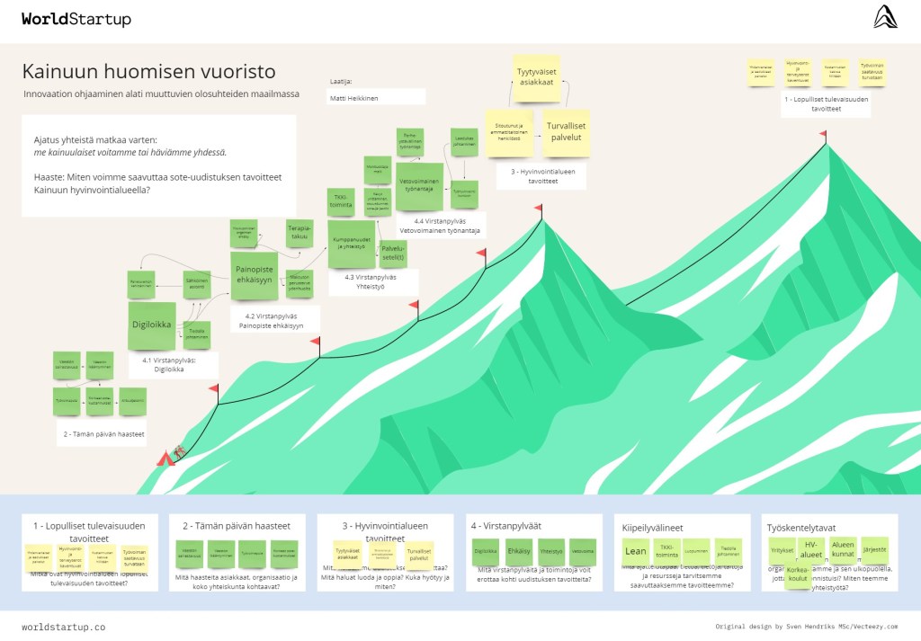 Keskeiset tavoitteet on vuoristossa kuvattu virstanpylväinä. Koska vuoristossa voi edetä monia reittejä, järjestys voi vaihdella. Joka tapauksessa tulisi panostaa ennaltaehkäisyyn, digitaalisten palveluiden ja asioinnin kehittämiseen, yhteistyöhön sekä työnantajan vetovoimaisuuteen.